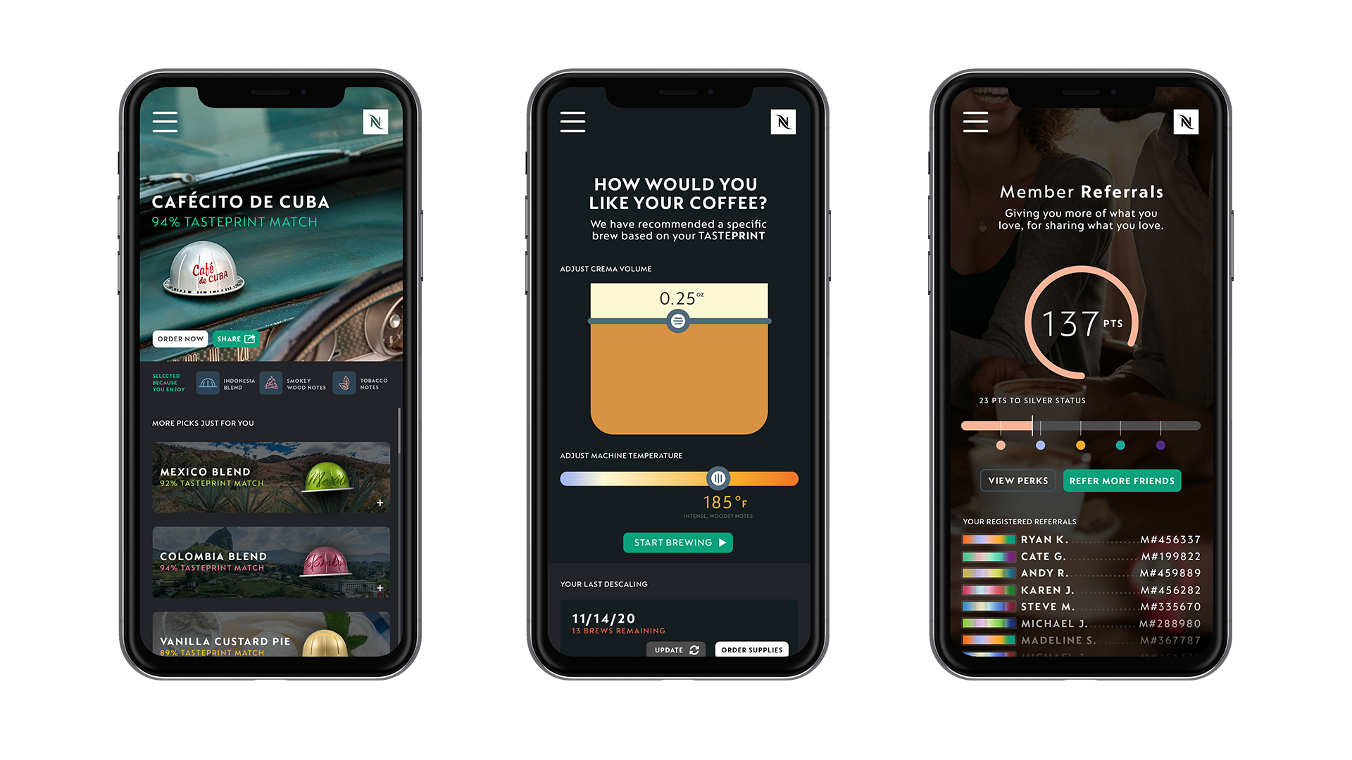 Nespresso determined customer loyalty was reliant on an affinity for the brand's carefully curated capsule offerings. In partnership with Nespresso's agency nmbl, we designed a companion app for machine owners that showcases their loyalty program. Allowing consumers to determine their TastePrint: the flavor profiles best fit for them, brand loyalists can track and order their favorite capsules, learning about their origin, the best way to use their machine, and what their sustainable usage footprint is. The client praised this initiative, establishing goals to implement the loyalty app with in-store and machine promotion tactics.